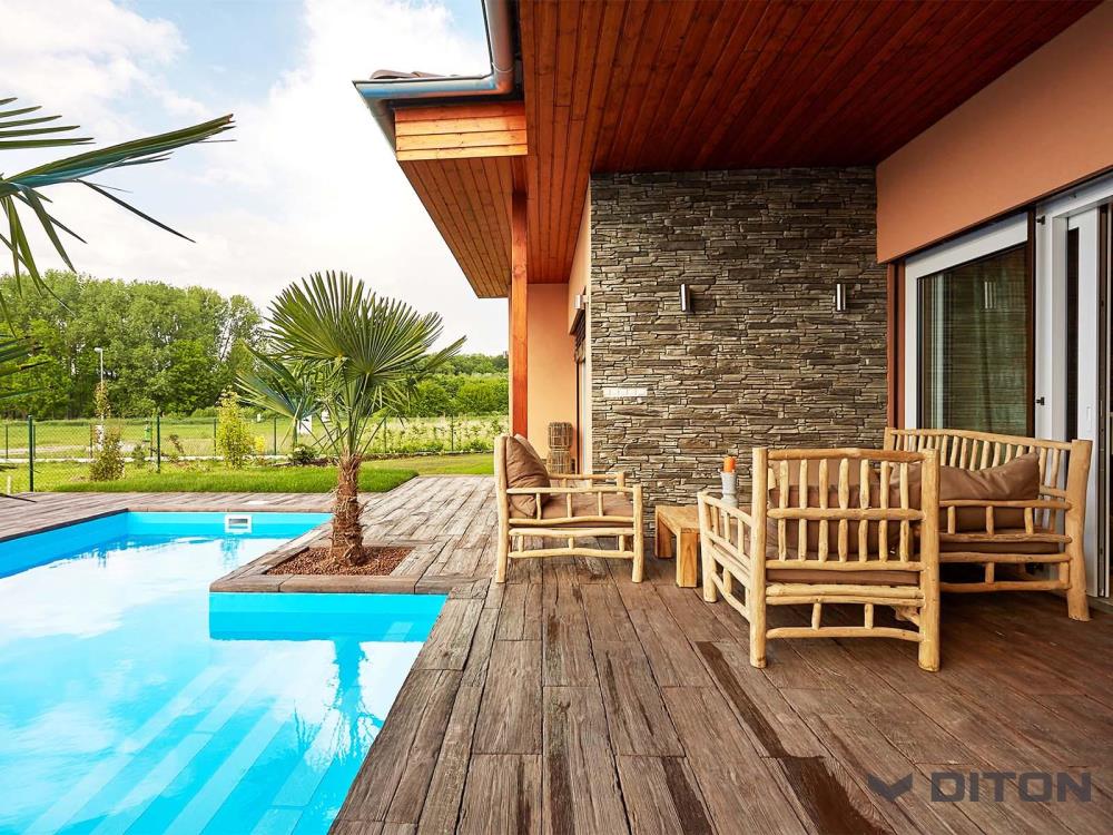 DOSKY – VZOR DUB z programu IMITÁCIE DREVA ponúkajú ľahké, ale pritom mimoriadne elegantné riešenie v podobe dokonale napodobených dubových dosiek. Dosky v štyroch formátoch a troch farebných odtieňoch ponúknu záhrade či domu krásu dreva s praktickými vlastnosťami betónových výrobkov. Vďaka špeciálnej povrchovej úprave už nie je nutné povrch lakovať, ani inak špeciálne ošetrovať. VZOR DUB charakterizuje oproti DOSKE SMREK hrubšia štruktúra s hlbším reliéfom. Pre dosky z tohto produktového radu sú k dispozícii aj bazénové lemy.
